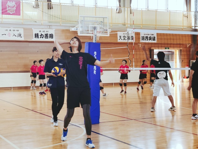 実技指導では、前半は大友愛、狩野舞子の指導のもとでレシーブ練習、アタック練習を行い、生徒たちはチームごとに分かれて何度も繰り返し練習を行いました。