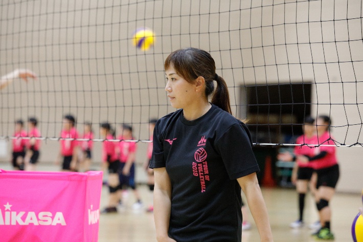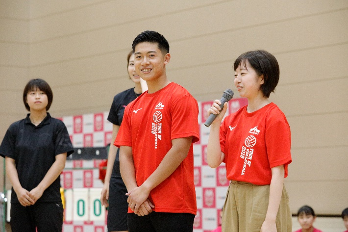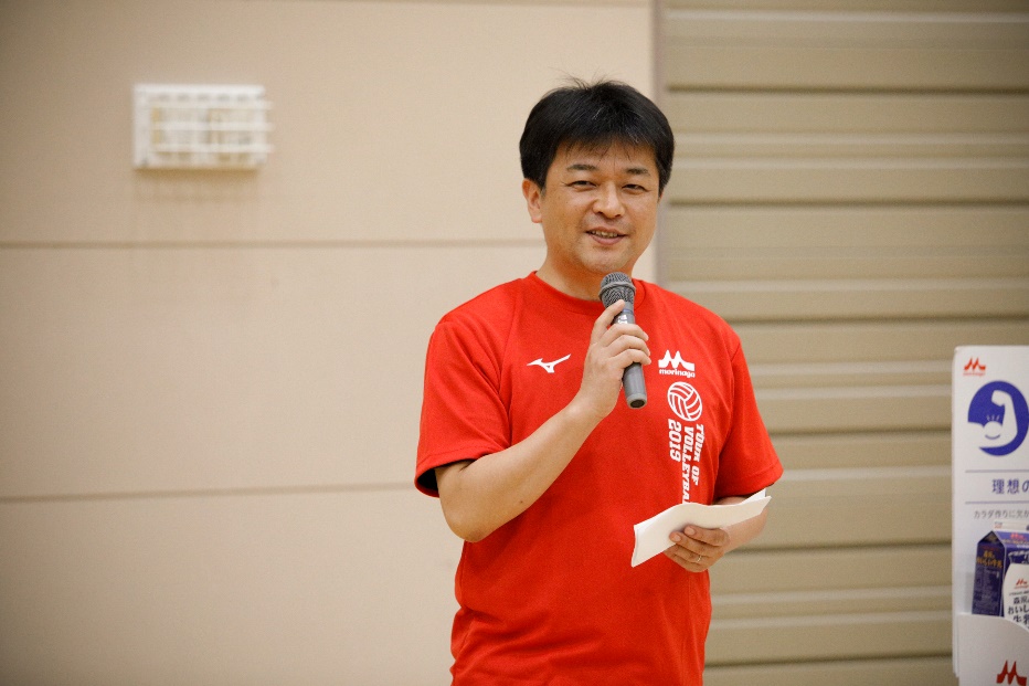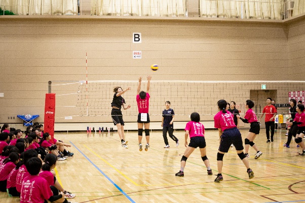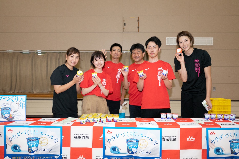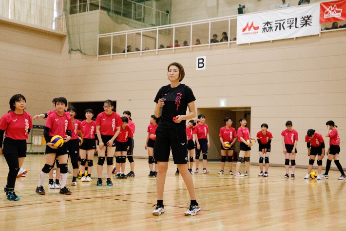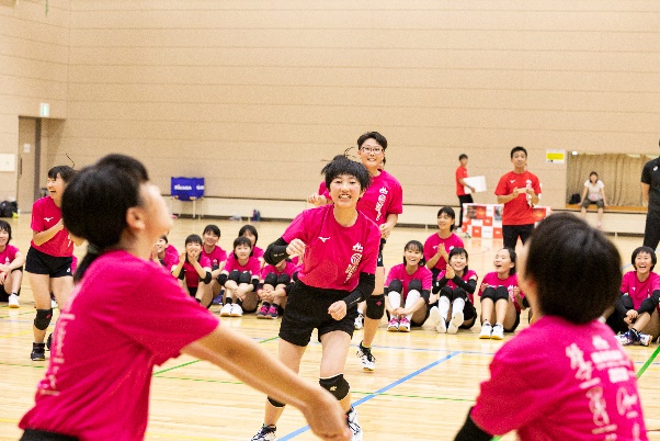 その後5点マッチのミニゲームを勝ち抜きトーナメントで行いました。どのチームも実力が拮抗していましたが、最後はナイスサーブを見せたチームが優勝。ゲーム中のプレーをみて、講師が4名をMVPに選びました。単にスキルだけでなく、大きな声と笑顔でチームを盛り上げて、明るく率いた生徒や、最後までボールを追いかけるファイトを見せた生徒が選ばれたことにより、バレーボールはチームプレーであることを改めて感じていただいたのではないでしょうか。続くエキシビションマッチでは、優勝したチームとドリームスとが対戦。5-0でドリームスチームが圧巻の強さを見せつけました。ドリームスチームに加わった森永乳業スタッフ2名の選手も、レシーブにアタックにと大活躍。