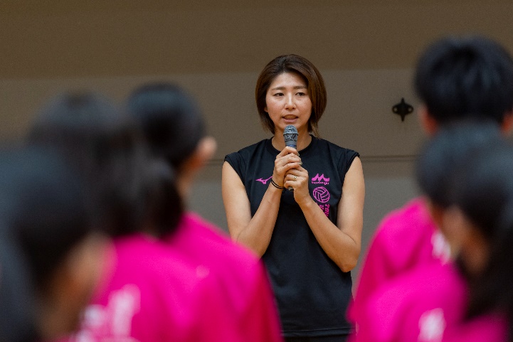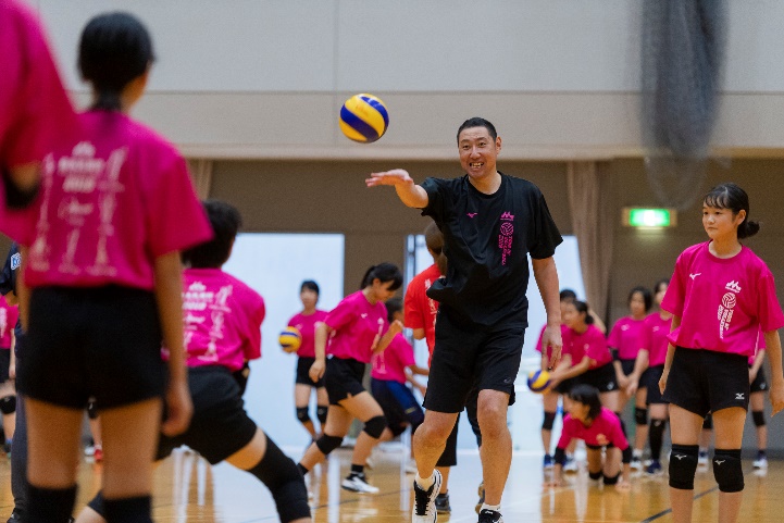 スパイク練習では、講師が参加者に「ジャンプをするときに、手をしっかり引く。高くジャンプをしたら打たない方の手をしっかり引くことを意識しよう」と指導。
