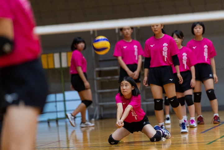 まずは二人一組になりボールを使ってウォーミングアップ。その後、各チーム1列になってレシーブ練習。膝立ちの体勢でレシーブしたり、うつぶせに寝て合図で起き上がってレシーブしたり、後ろ向きに構えて合図で正面を向いてレシーブする3種類の練習を行いました。