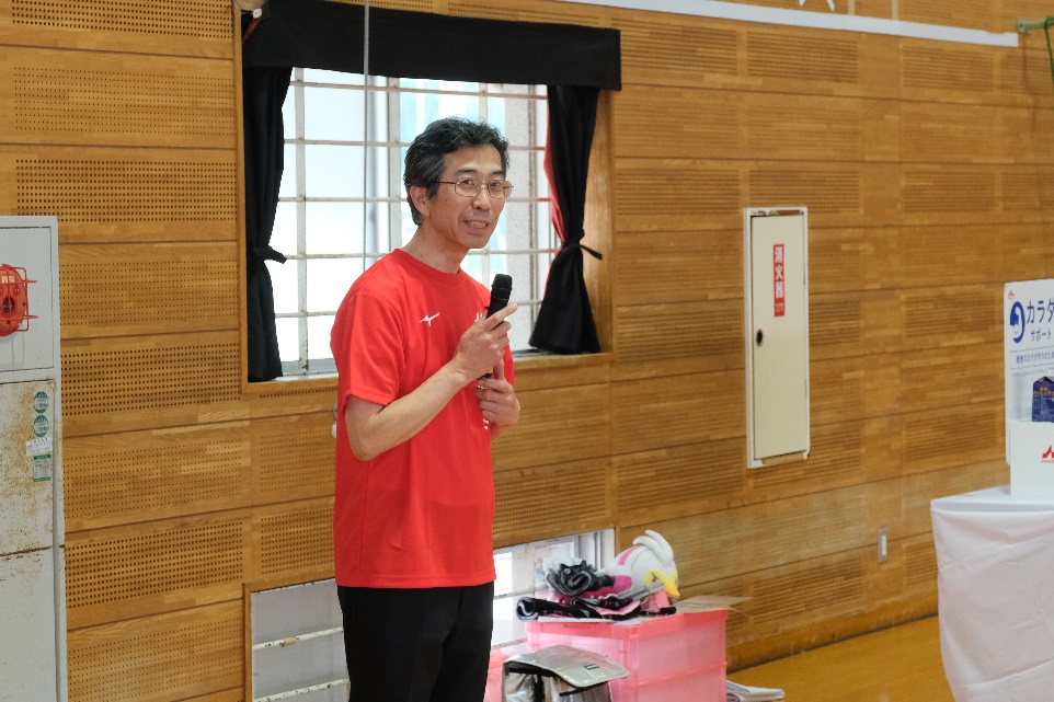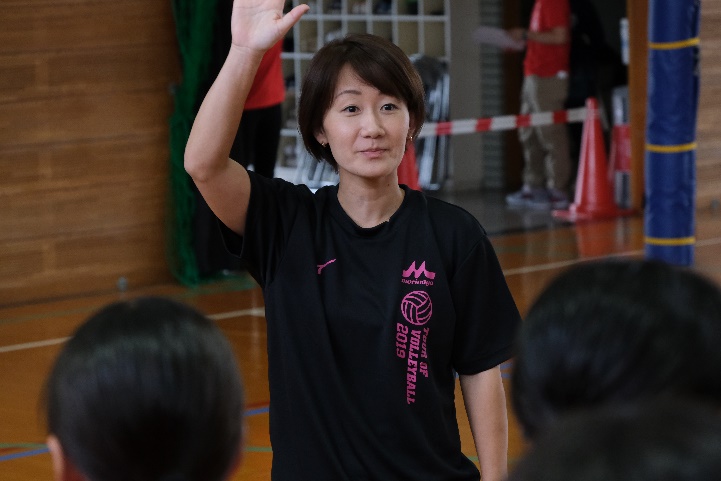 佐野優子はレシーブを指導。「きちんと面を作って、返す人の方をむける。ボールを優しくかえすことを意識するように」とアドバイスをしました。