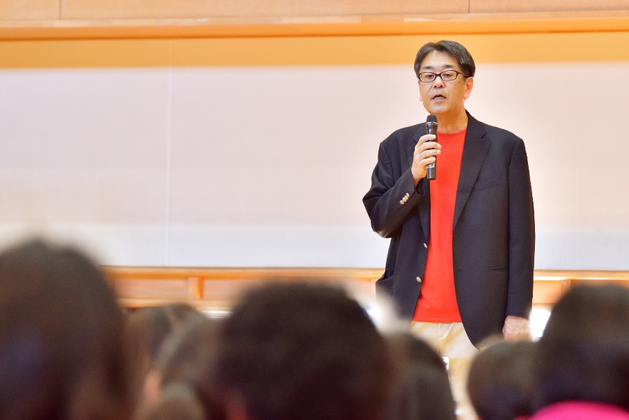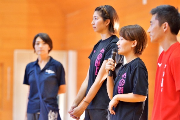 実技練習の後半は、スパイク練習です。大友愛は「手だけではボールに力が伝わらないのでしっかり右肘を引いて打つ。左側左手も重要。しっかりコースを狙ったボールが得点につながる。長いコースを狙って、コントロールして打つこと」とアドバイス。まずはジャンプをしないでアタックラインから上がってきたボールをセンターラインに向かって打ち付ける練習を行いました。続いて、3箇所に分かれ、奥を狙ってジャンプしてのスパイク練習を行い、何度も繰り返し練習に励みました。