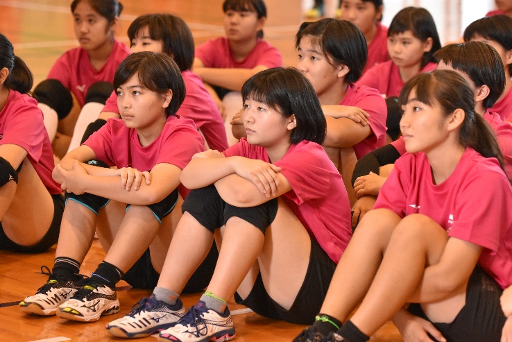 大会は、アップから開始しました。2人1組になってボールを使用し、普段行わないようなアップを楽しく行い、実技練習に入りました。まずは、レシーブ練習です。チームごとに分かれ、オーバーパスの練習です。ボールをきちんと持って、飛んできたボールを、そのボールを使って前へ返す練習をしました。アンダーパスでは、低い姿勢のままレシーブすることが大切と佐野優子が指導しました。後半は、スパイク練習を行いました。6か所に分かれてエンドラインを狙って打つ練習を何度も行いました。実技練習最後は、ミニゲームに向けてサーブ練習を行って終了しました。
