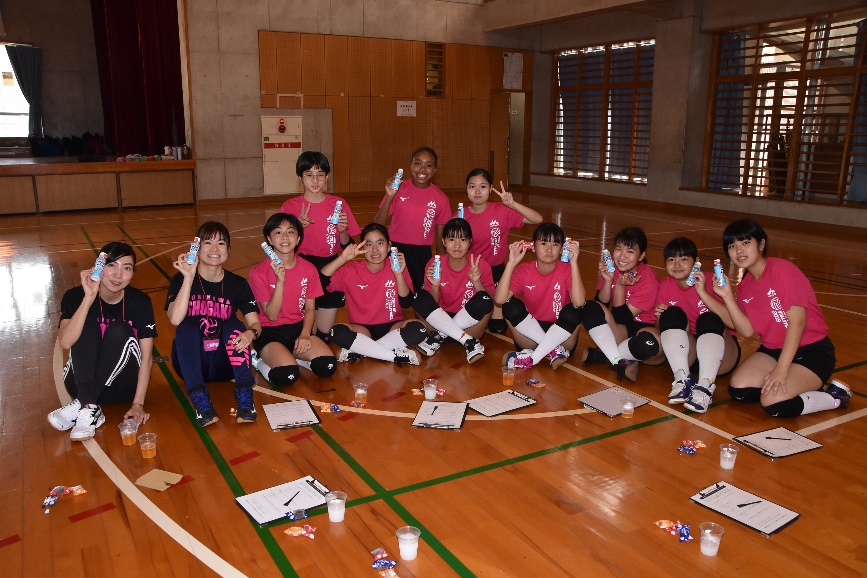 水分補給をした後にミニゲーム(5点ポイント制)の勝ち抜きトーナメントを10チームで行いました。決勝を勝ち抜いた優勝チームには最後のお楽しみプレゼントととして、ドリームスチームとの対戦をしてもらいました。ドリームスチームには、講師2名に、森永乳業スタッフ3名、教員の先生が1名が加わりました。狩野舞子がブロックを決めて2-1とドリームスチームがリードしたものの最後は優勝チームがサーブを決めて、6-4で接戦を制しました。