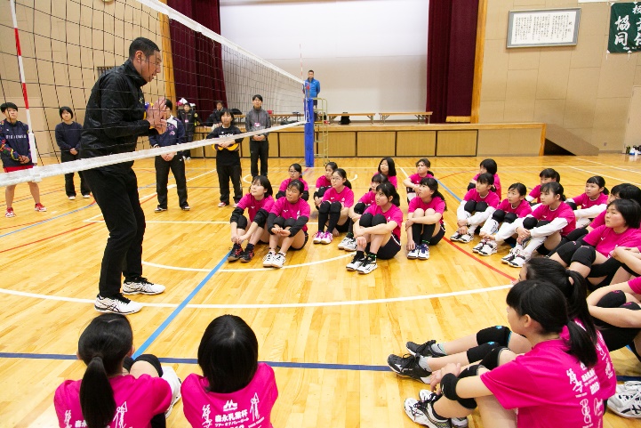 レシーブする時の足は、きちんと左右広くとる」と3つのことを意識することと指導があり、4箇所に分かれてサーブカットの練習をしました。また、「ボールをさわるタイミング、腕でしっかり面をつくることが重要」と指導しました。 アタック練習ではブロックも組み込み「攻撃してくる相手の位置によって、ブロックの位置を考えないといけない」と指導。アタック練習では「打たない方の手をしっかり引く。早く入りすぎない。練習の時からブロックを意識しながらアタック練習をすると試合の時に役に立つ」と熱く指導しました。