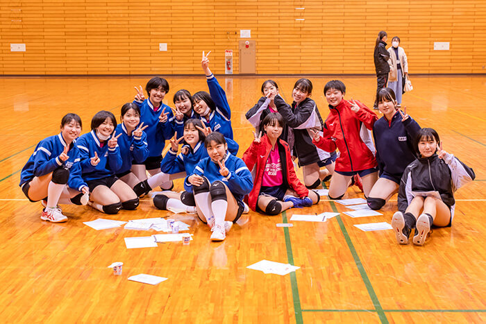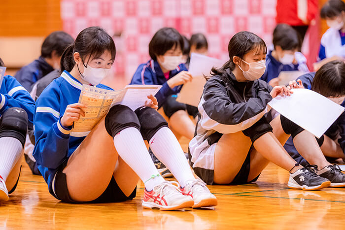 事前のチーム分けでは、あっという間に各チームのキャプテンが決まり、自主性の高さが見えました。最初のアップではバーチャルバレーボールノートに掲載しているストレッチや、ボールを使ったアップを行い身体を温めました。