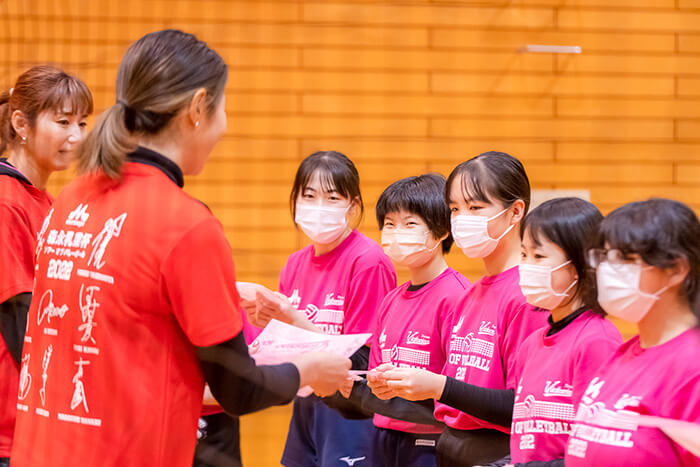トーナメント制5点マッチのミニゲームは、どのチームも実力拮抗していましたが、優勝は、黄色チームでした。最後に勝利のプレゼントとして、顧問の先生とドリームスがタッグを組んだドリームチームと戦いました。狩野さんがジャンプサーブを打った時には歓声が沸き、参加者もオリンピアンのプレイを目の前でみれて嬉しかった様子でした。ドリームマッチの結果は5-1でドリームスチームが圧巻の強さを見せつけました。最後に、練習中やミニゲーム中ずっと大きな声を出してプレイしていた生徒に特別賞MVPとして、二人の直筆サイン入り色紙がプレゼントされました。