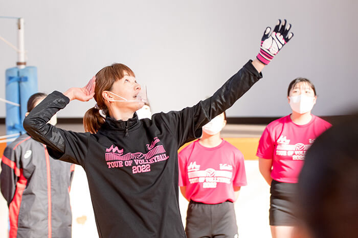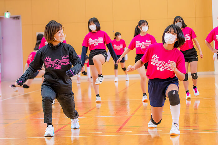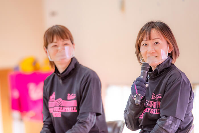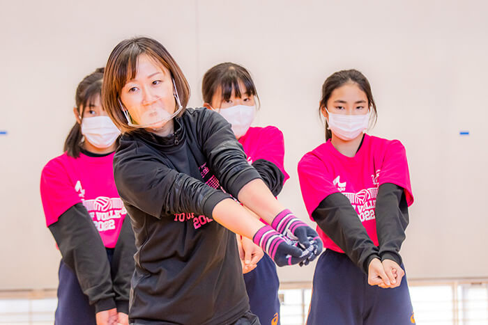 実技指導前には、ウォーミングアップの時間を少し長めに取り入れ、冷えてしまった体を温めました 。その後2つに分かれて、佐野さんがレシーブを担当、井上さんがスパイクを担当し練習を行いました。サーブレシーブ(レセプション)の指導の際、佐野さんは「アンダーの時は、腕できちんと面を作ることが大切。サーブカットでもスパイクを受ける時も同じ」と正しいフォームを見せながら指導していました。また、スパイク担当の井上さんは「左手をしっかり上げて、下に打ち付けるのではなく長めのコース(エンドライン)を狙って打つことも大切」と指導しました。椅子を目印として、そこを狙って打つ練習を行いましたが、難しいと参加者は何度も繰り返し練習を行いました。