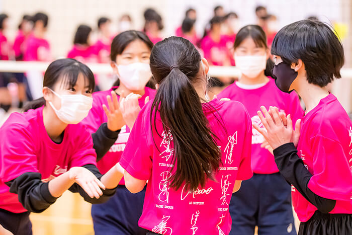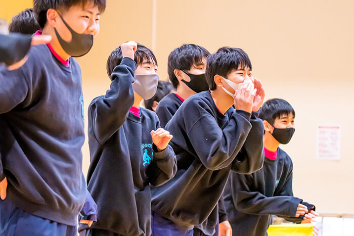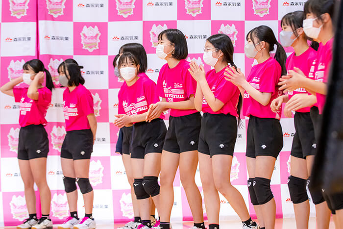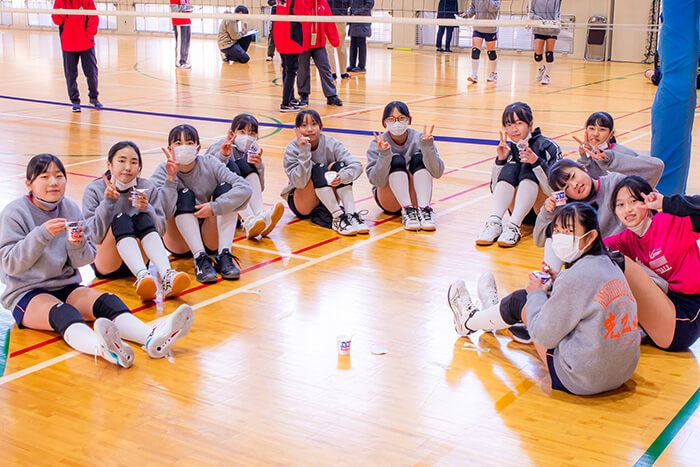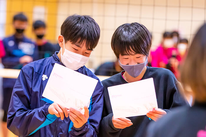 最後は、時間制ミニゲームを行いました。各コート最多得点のチームがドリームスと顧問の先生がタッグを組んだドリームスチームとの戦いを手にすることができ、ドリームマッチを2試合行いました。敗退した参加者も、楽しく応援しながら観戦できた様子でした。ミニゲーム中チームワークが良かったチームにMVP賞として、二人の直筆サイン入りマスクケースがプレゼントされました。