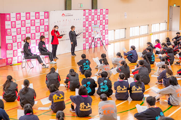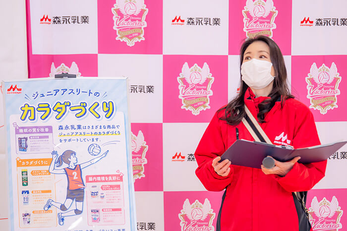 栄養講話では、ジュニアアスリートのカラダづくりについて森永乳業の持田さまと講師のお二人にお話をしていただきました。佐野さんからは、食事をバランスよく食べることの大切さのお話を、井上さんからは食事を取ることが苦手だったが、牛乳が大好きでいつでも牛乳を飲んでいたことや補食の取り方について等のお話をきくことができました。怪我をしないカラダ作りのために必要なことを、持田さま、講師のお二人から参加者へ伝えていただきました。