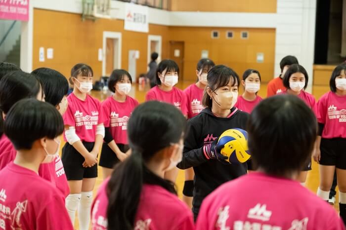 栄養講話終了後、冷えてしまった体を温めるためにまずは、ランニングスタートしました。佐野さんが生徒たちに指示をだし、バレーボールノートに記載されているストレッチ等を行い、身体を温めました。アップ後は、AコートとBコートの2つに分かれて、竹下さんがボールコントロールの指導を担当、佐野さんがレシーブ指導の担当し実技練習を行いました。ボールコントロールの練習では、竹下さんが、「オーバーハンドパスのどういう所が苦手なのか?」と質問をし、生徒からは「高く飛ばせない」「コントロールが難しい」「距離がのびない」等の理由があげられ、オーバーパスの基本を丁寧にわかりやすく説明していました。また、強打レシーブをして、それを自らオーバーパスで前に返す練習も行い、何度も生徒達は繰り返しボールコントロールの練習をしました。また、佐野さんのレシーブ練習では、レシーブする際のポイントとして、「落下点を早く見つけること。手を振らず、足でボールを運ぶことが大切」と生徒に指導しました。サーブカットの練習も繰り返し行いました。