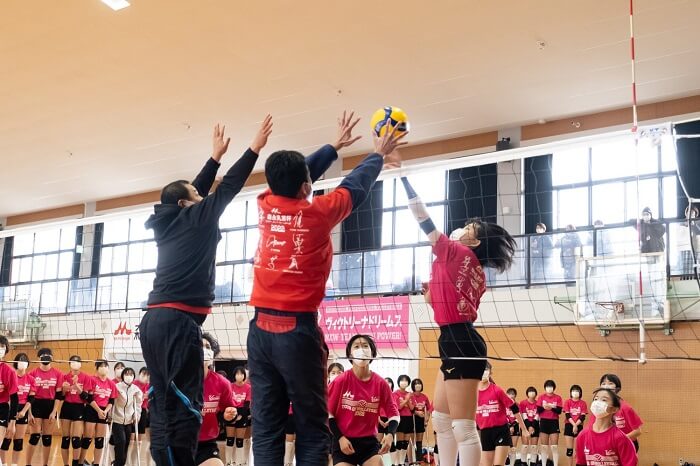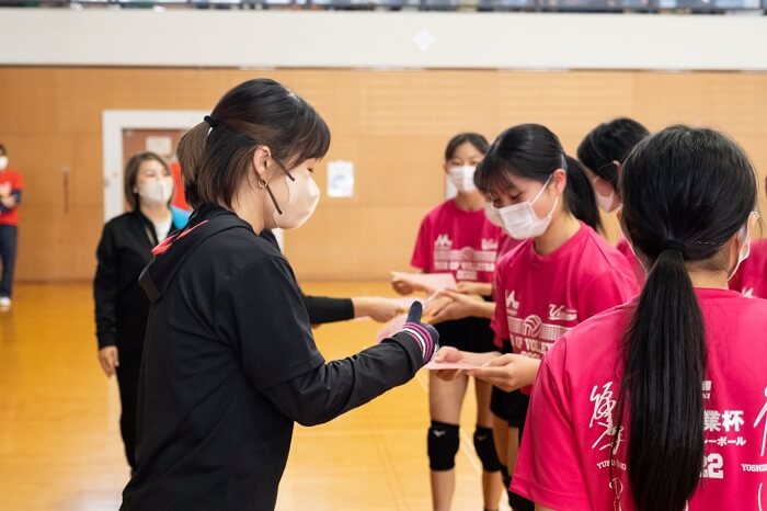水色チームvsドリームスチームの戦いは、佐野さんのサービスエースもあって6-2でドリームスチームの勝利。また、オレンジチームとの結果は、顧問の先生方によるブロックポイントやサービスエースなどにより5-3でドリームチームが勝利しましたが、最後の最後でオレンジチームも強烈なアタックを決め、会場全体がとても盛り上がりました。