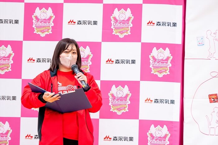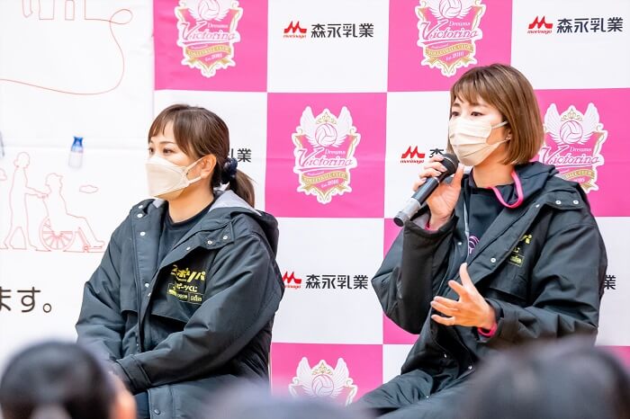栄養講話では、森永乳業の堀様と講師のお二人にお話をしていただきました。竹下さんは、「現役当時は、栄養士さんもいたのでバランスよく食事を食べていた。」と話し、大友さんからは、「練習時や試合の時も、とにかく動いている時間が⾧かったので、普段の食事だけでは栄養を摂取できなかったので補食を取り入れていた」等、現役時代の栄養についてのお話を伺うことができました。