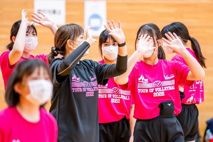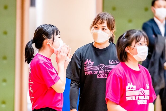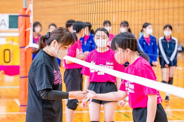 大友さんは、スパイクを打つ際に、下に強く打ち付けるのではなく、ボールをエンドラインを目掛けて⾧いコースを狙って打つことを意識して打ってみようと指導していました。また最後に、ミニゲームでサーブがしっかり入るように5分間のサーブ練習を行いました。