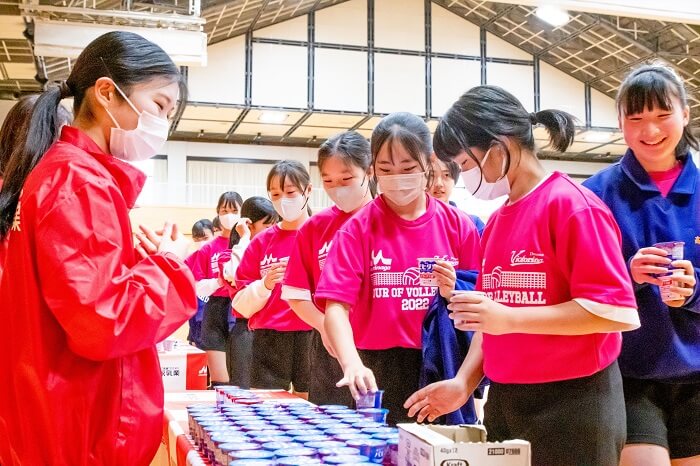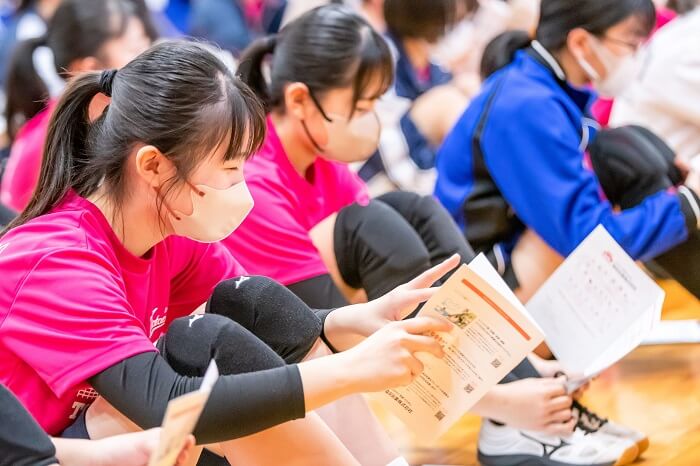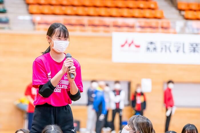 後半は、12チーム各1試合の時間制ミニゲームを行いました。3分間の戦いでAチームが、Gチームが勝利しました。勝利したAチームとGチームが、ドリームスと顧問の先生がタッグを組んでできたドリームスチームと戦うことになりました。Gチームとの戦いでは、まずドリームスチームが2-0とリードしました。Gチームも攻めてスパイクを決めて1点奪います。しかし、大友さんのサービスエースや顧問の先生のスパイクが次々と決まり7-1までドリームスチームが先攻しました。Gチームもなんとか踏ん張り、ラスト1本ではアタックを決めることができ2点目をとることができました。結果は7-2でドリームスチームの勝利となりました。2試合目のAチームとの戦いでも、ドリームスチームが圧倒的強さを見せました。なんとかAチームの選手も粘りますが、高い壁を越えることが難しく9-1とドリームスチームの勝利となりました。全体に声がでている大会とでしたが、その中でも最も元気があってチームワークがよかったCチームがMVPチームとして選ばれ、お二人の直筆サイン入りマスクケースをプレゼントされました。