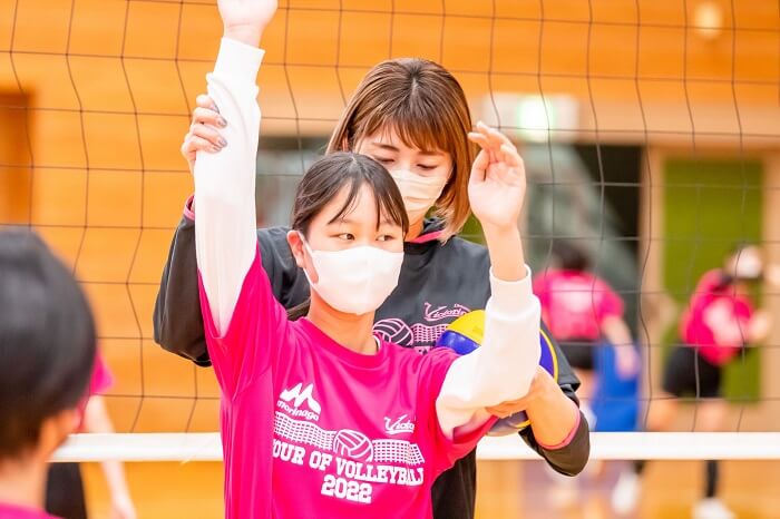 実技練習では、竹下さんがオーバーパスと強打レシーブの指導を、大友さんがスパイクの指導を行いました。竹下さんは、オーバーハンドパスでは、「キャッチする人が多いのでボールを持たないように」と確認を行い、ボールの下に素早く入ること、基本を意識して練習するようにと伝え、個別にアドバイスを送りながら指導をしていました。