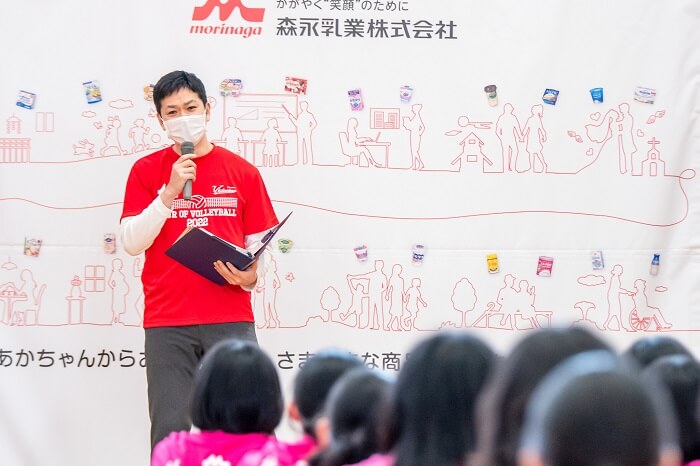 栄養講話では、森永乳業の堀様と講師のお二人にお話をしていただきました。狩野さんは「中学2年生で既に182㎝あり身長が伸びるのが早かったし、ケガが多かった。高校を卒業して実業団に入ってから栄養士さんの指導を受け、調理方法や味付けを工夫してなるべくバランスよく食べるようにしていた」と話しました。井上さんも、「中学時代は食べることが苦手で唯一牛乳が好きで牛乳をたくさん飲んでいた。現役中も、食べることは苦手だったけど、バランスよく食事を食べるように意識していた」と当時の食生活を振り返りながら、参加者に食事の必要性を伝えていました。堀さまからは、空腹で運動をしないことや、朝食をきちんと食べること、運動直後のゴールデンタイムに栄養を補うことが大切であることを伝えていただきました。