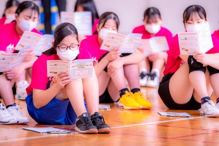 TOV2022最後の大会は岡山にて実施となりました。設営準備には、岡山市立芳田中学校と芳泉中学校の生徒さんがお手伝いしてくださいました。参加者は少なかったですが、とても雰囲気の良い大会で楽しい岡山大会となりました。実技練習では、井上さんがスパイクの指導、狩野さんがレシーブの指導を行いました。井上さんは、「スパイクを打つ時は右手だけでなく、左手もしっかりあげること。また、打つ際に、下に強く打ち付けるのではなく、長いコースを狙って打ってみよう」と狙う場所に椅子を置いて、きちんと狙って打つことを意識させるように指導しました。2グループにわけて、椅子を狙ってスパイクを打ち、2分間で何本椅子に当たったかを競うゲーム感覚のような練習も行い、参加者も楽しく真剣に練習に励んでいました。