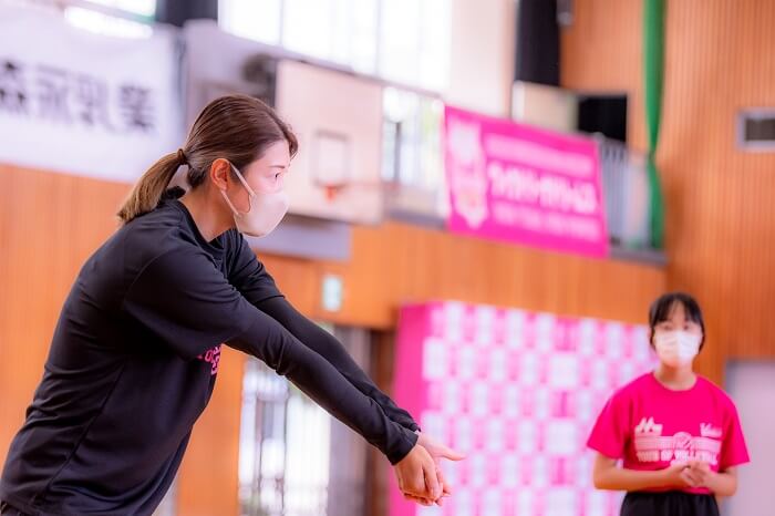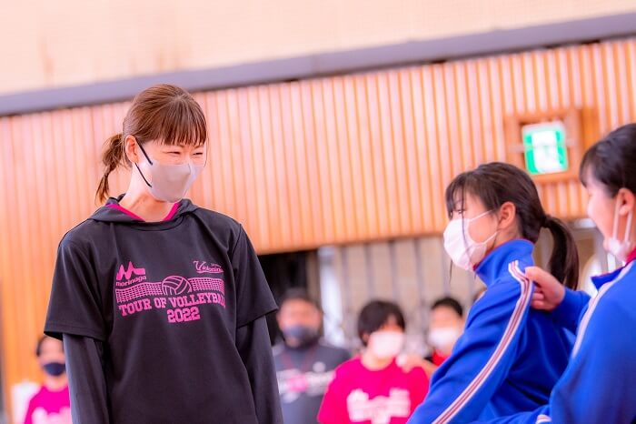 狩野さんは、レシーブで大切なことは「まず、腕の面をうごかさないこと。動きながらとることは良くないので、必ず一旦止まること」とレシーブの基本についてフォームを見せながら指導しました。また、強打レシーブから2段トスの練習も行いましたが、その際に、「ボールをつなぐ人がどこにあげてほしいかを考えること、2本目を上げる人は、スパイクを打てるようなトスをきちんと上げること」と指導し、最後に「全てのプレーにおいて準備が大切!準備を素早くすること」とアドバイスを送っていました。