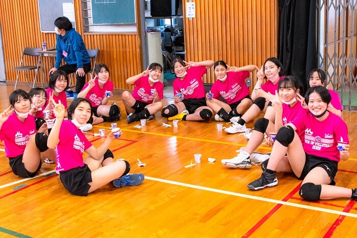 後半は、8チーム各1試合の時間制ミニゲームを行いました。3分間の戦いでAコートでは最多得点6点をとったAチームが、Bコートでは最多得点7をとったGチームが勝利となりました。勝利した2チームは、ドリームスと顧問の先生がタッグを組んでできたドスチームと5点マッチの試合を行いました。Aチームとの戦いでは、サーブやアタックでAチームが4-2とあと1点までリードしました。しかし、ドリームチームも踏ん張り、徐々に点差を詰めて4-4と同点にします!最後の1点をどちらがとるのか、会場内もとても盛り上がりました。結果、5-4でドリームスチームが大逆転で勝利しました。Gチームとの試合は、まず1点をナイスフェイントでGチームが先取しますが、Aチームとの戦いを制したドリームスチームの勢いは止まらず…5-1とドリームスチームの勝利となりました。MVPチーム賞は、ドリームスチームを追い込んだAチームが選ばれ、お二人の直筆サイン入りマスクケースをプレゼントいたしました。