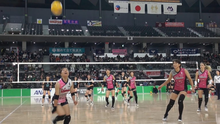 1セット目序盤、攻撃のテンポの早い筑波大学と一進一退の展開となるが、ヴィクトリーナが硬いディフェンスを見せ、自分たちの攻撃のリズムを作っていく。