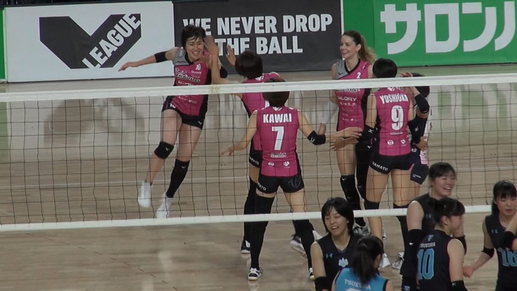 絶好調の金杉、高さとパワーのあるスエレ、途中から入ったミドルの中本の移動攻撃など、相手に的を絞らせない攻撃でヴィクトリーナが25-16でセットをものにし、3-0のストレート勝ちで駒を次に進めた。