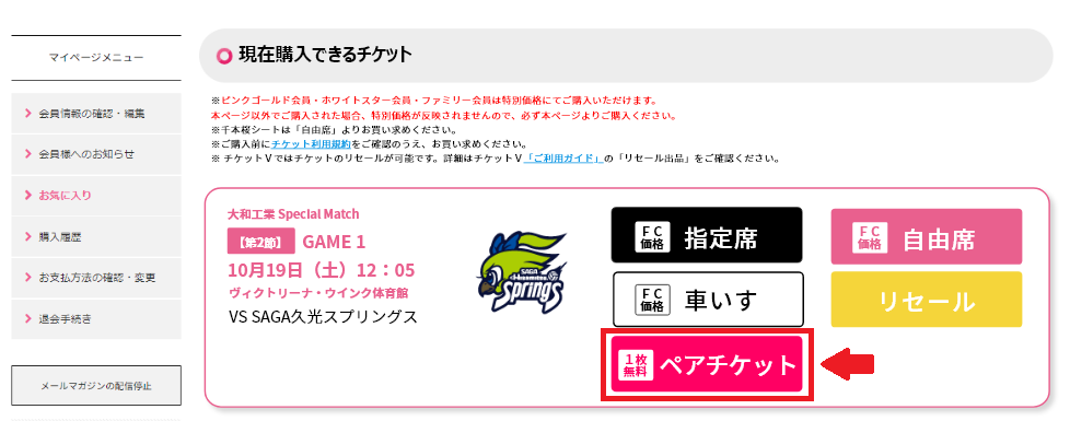 会員マイページに、各試合のチケット購入ボタンが表示されます。該当試合日内に表示される「ペアチケット」をクリックし、専用ページよりご購入ください。