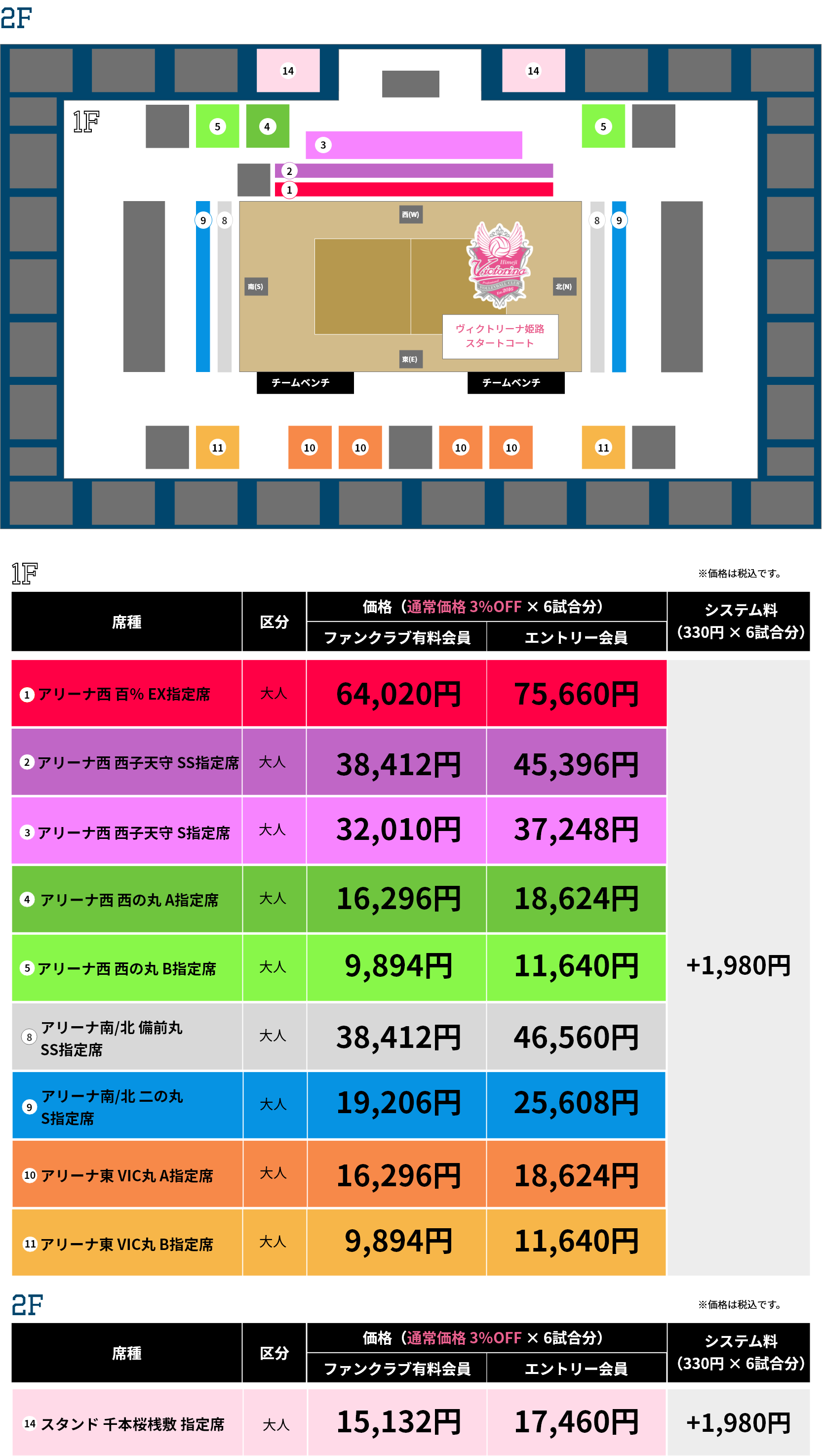 - チケット合計金額に別途1,980円(システム料330円×6試合分)が発生します。