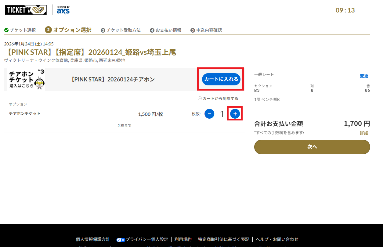 2.「【会員ランク】20260124チアホン」欄の「詳細を表示」を押下し、ご利用人数分を選択し「カートに入れる」。