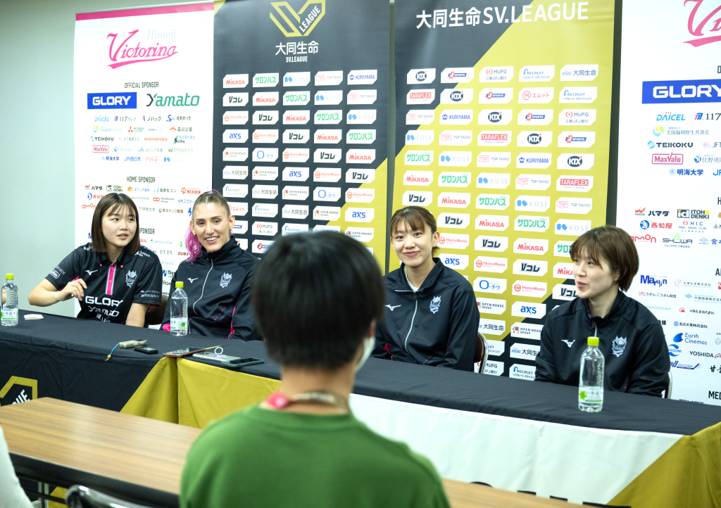 ホームゲーム招待では生徒のみなさんがご家族と一緒に来場し、ヴィクトリーナ姫路の熱戦を楽しんだ後は、ホームチームの記者会見に参加し、アヴィタル・セリンジャー監督や会見に参加した野中瑠衣選手、福留慧美選手、カミーラ・ミンガルディ選手へ質問をしました。
