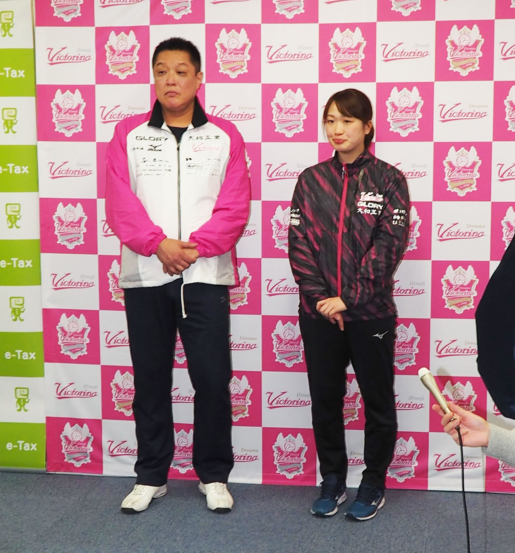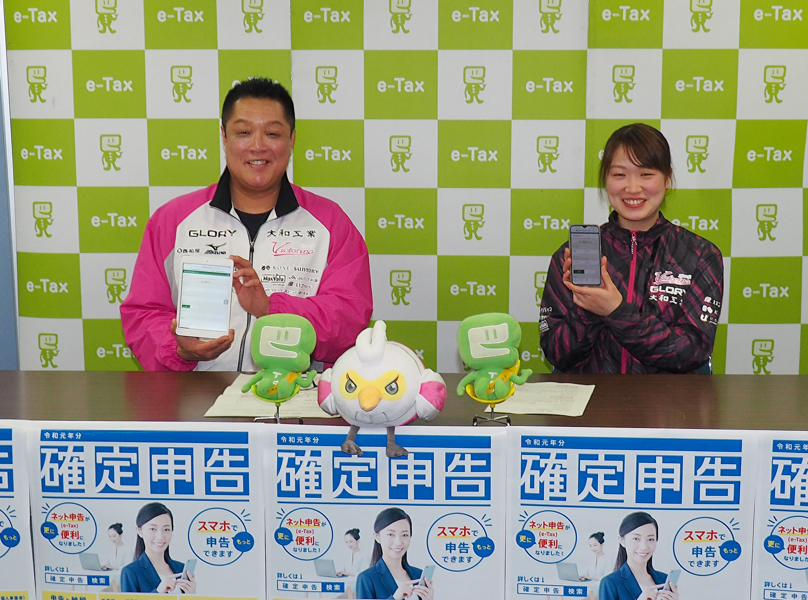 姫路税務署では、令和元年分確定申告が始まるのに合わせ、e-Tax(国税電子申告・納税システム)を利用した申告を進めるためのPRイベントを2月14日に開催。この催しに、姫路市をホームタウンとするプロバレーボールチーム「ヴィクトリーナ姫路」から、眞鍋政義球団オーナーとセッターの櫻井美樹選手が参加しました。